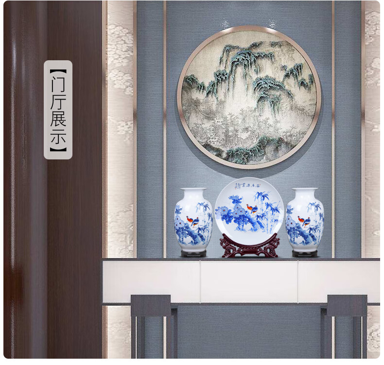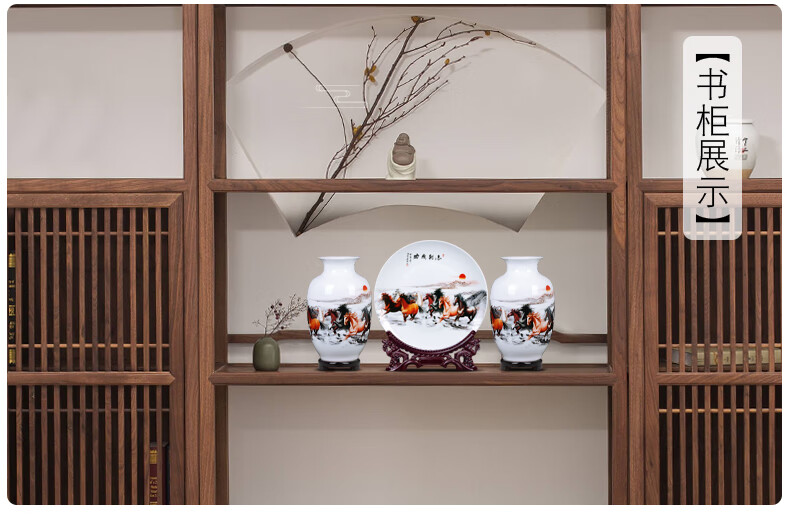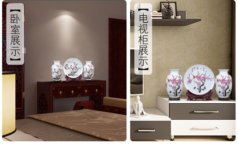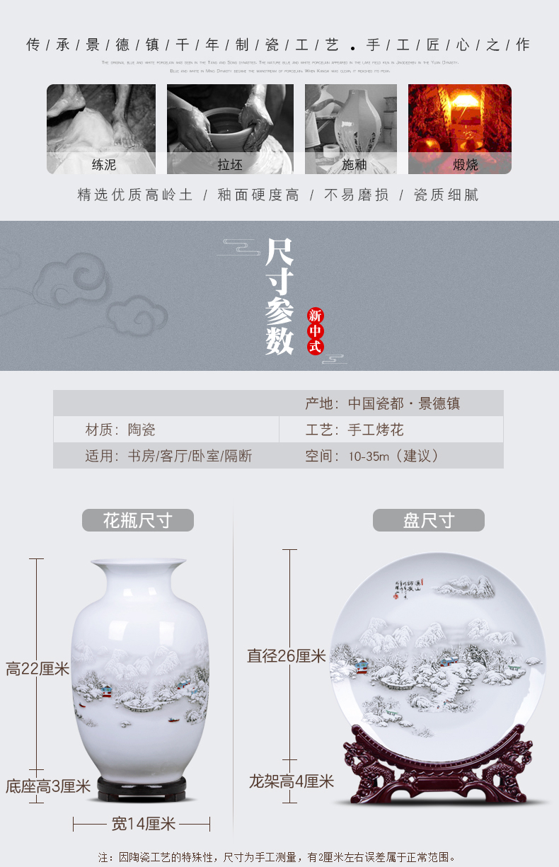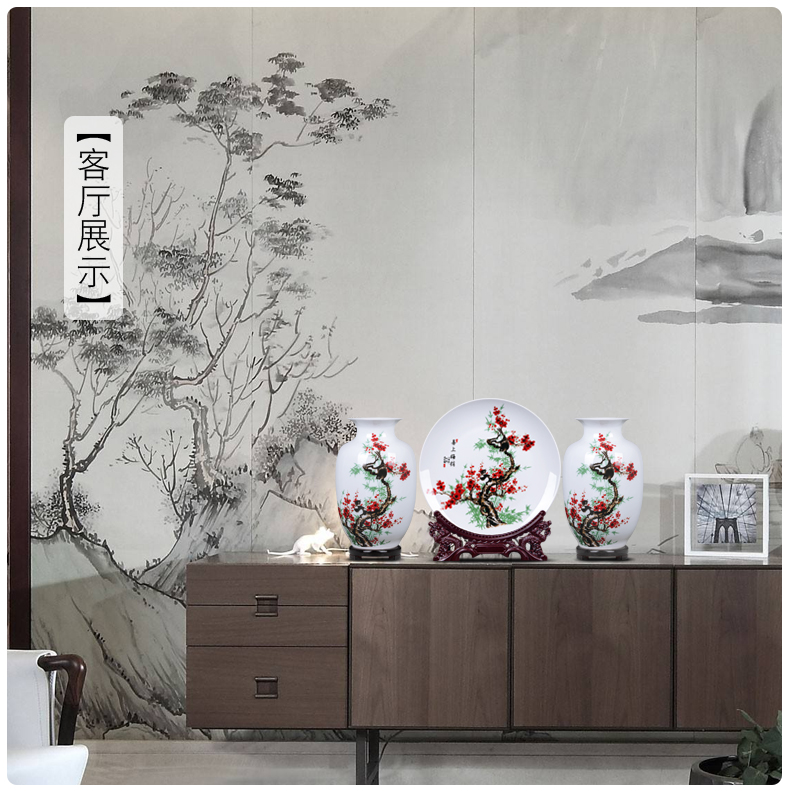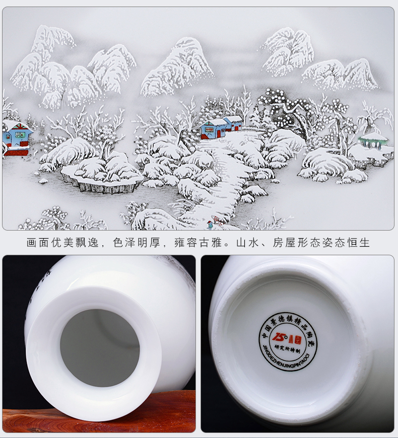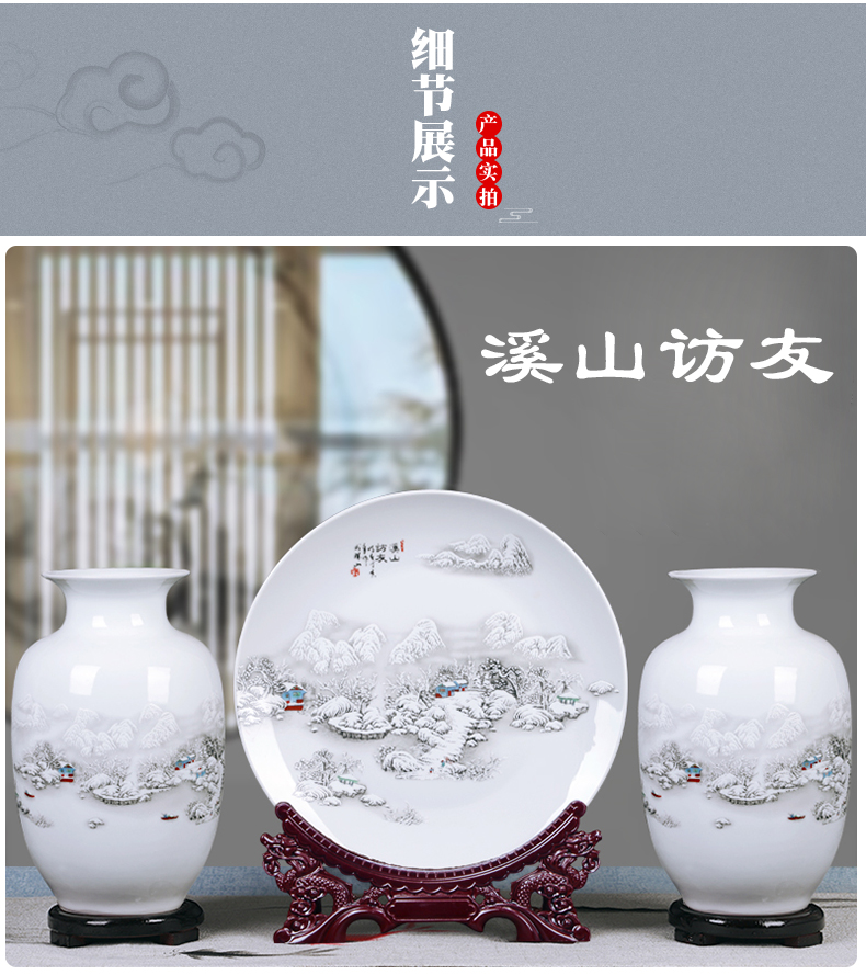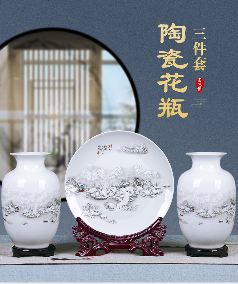 景德镇陶瓷器花瓶插花三件套中式电视柜装饰摆件家居客厅小工艺品雪景(木底座+龙头架)