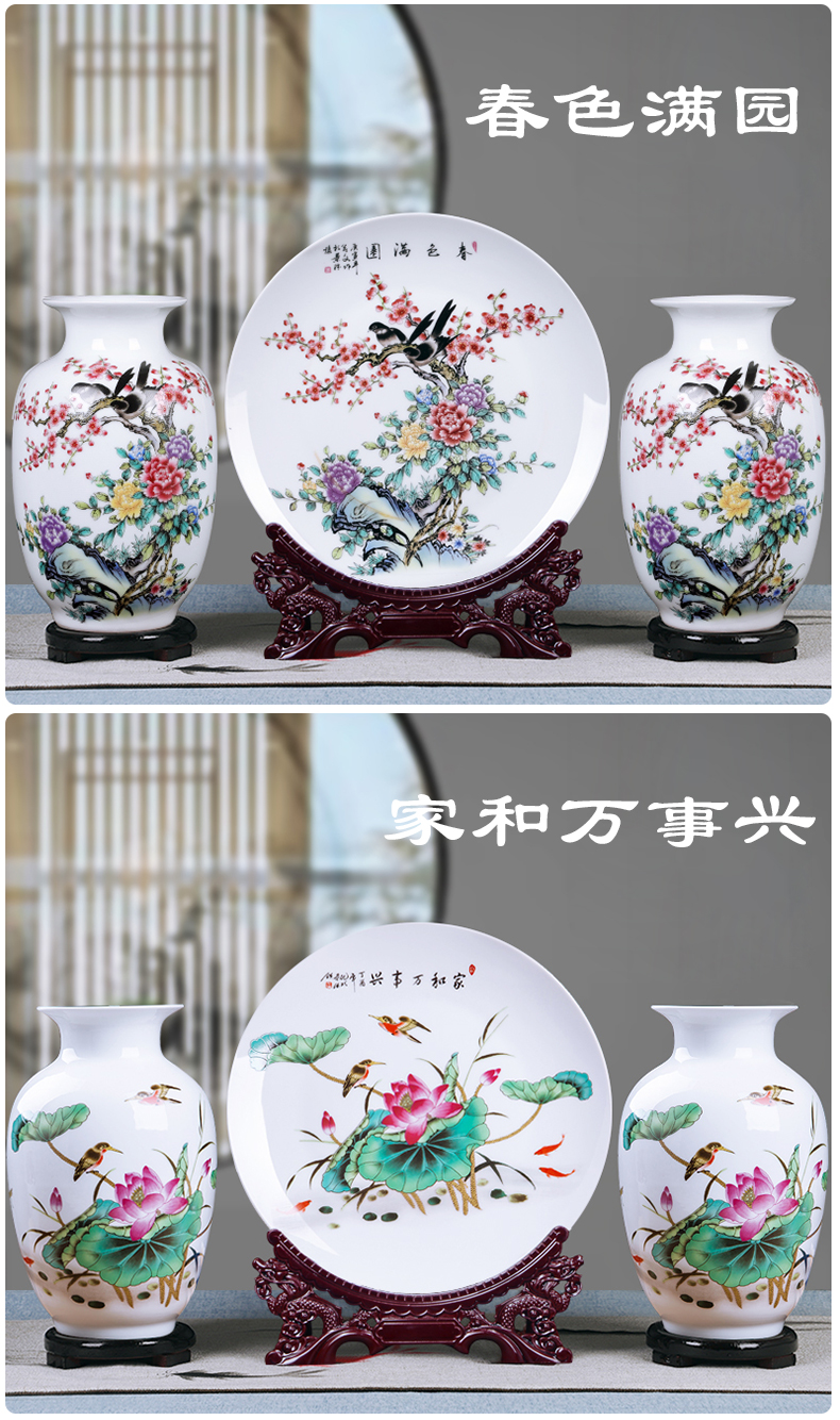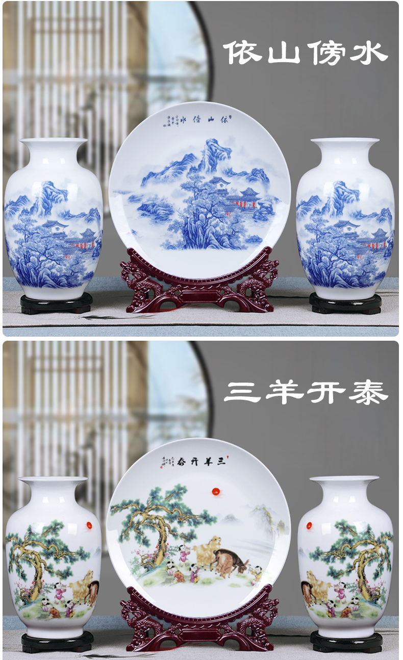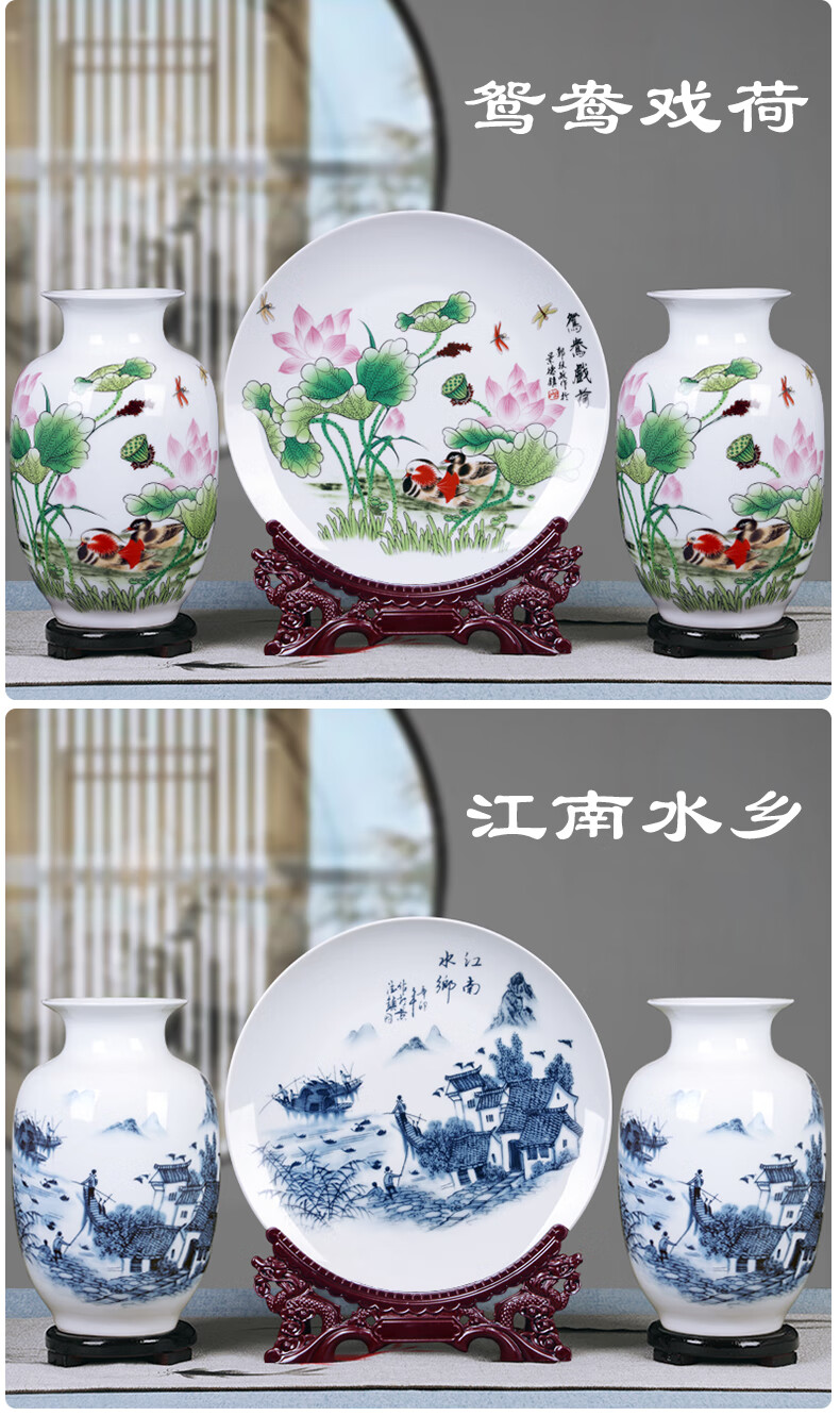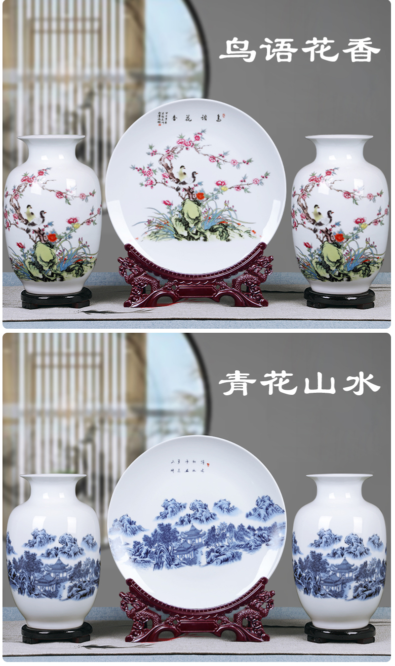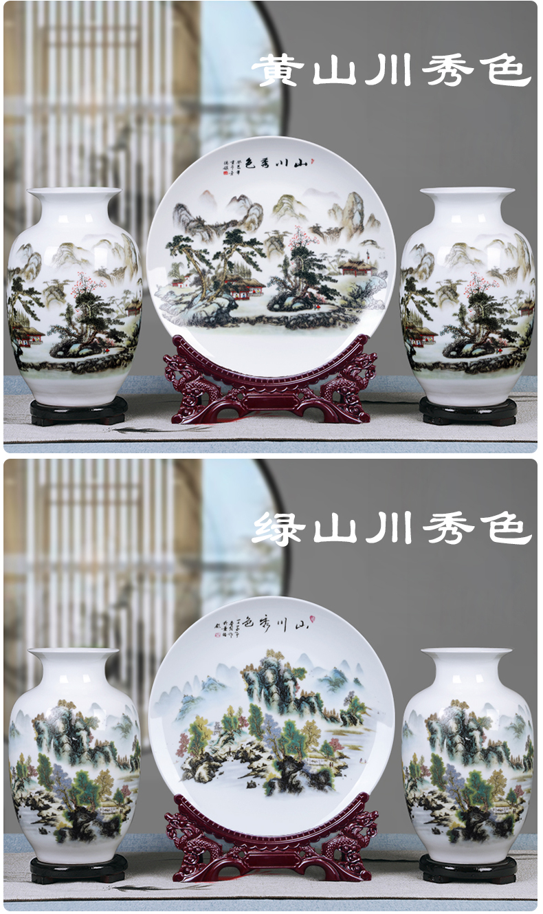景德镇陶瓷器粉彩山水三件套花瓶挂盘家装饰品客厅工艺品摆台福禄双全单个瓶(底座)